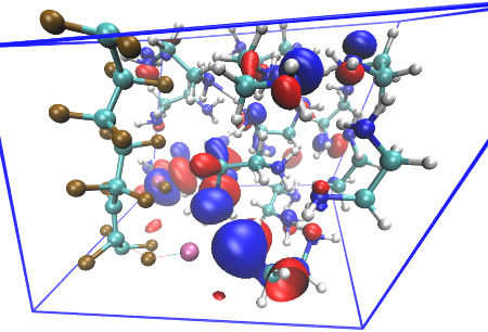 Le code dans ce travail est CP2K https://www.cp2k.org/. En effet, il est parallélisable, mis à jour régulièrement et différents outils peuvent compléter ces calculs pour comparer des mesures spectroscopiques aux simulations théoriques (code TRAVIS, tool for analyzing and visualizing trajectories from all kinds of Molecular Dynamics or Monte Carlo simulations.http://www.travis-analyzer.de). Le code PACKMOL https://m3g.github.io/packmol/index.html a été utilisé afin de créer un point de départ pour les simulations de dynamique moléculaire en regroupant les molécules solvatées par l’éthylènediamine. Le regroupement garantit que les interactions répulsives à courte portée ne perturbent pas les simulations. Le code Volume guesser https://m3g.github.io/packmol/nmols.shtml calcule le volume du système contenant un nombre donné de molécules de différents types afin que la densité finale ait une valeur souhaitée.